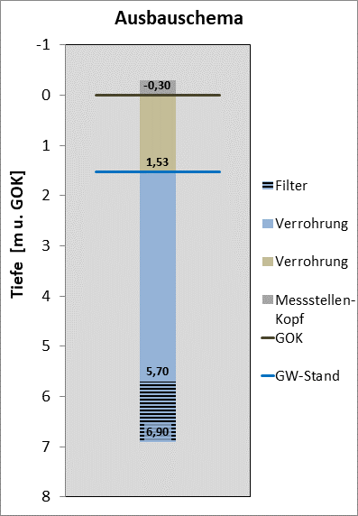 Die messstellenspezifischen Messwerte und Datenauswertungen liegen sowohl in tabellarischer als auch in graphischer Form vor, der Darstellungszeitraum ist auswählbar. Zusätzlich sind die für die Grundwassermessstellen zugrundeliegenden Stammdaten inklusive Ausbauschema und Bohrprofil verfügbar.