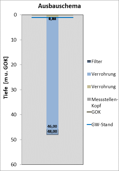 Die messstellenspezifischen Messwerte und Datenauswertungen liegen sowohl in tabellarischer als auch in graphischer Form vor, der Darstellungszeitraum ist auswählbar. Zusätzlich sind die für die Grundwassermessstellen zugrundeliegenden Stammdaten inklusive Ausbauschema und Bohrprofil verfügbar.